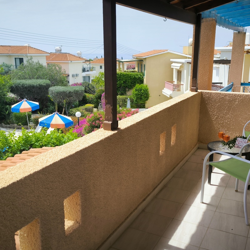 Experience comfort and style in our charming two-story townhouse. The first floor features a modern, fully-equipped kitchen that flows into a dining area and living room, complete with a spare bed for two and a convenient toilet. Step outside to a terrace with sunshades, perfect for relaxing by the pool. On the second floor, you'll find a bathroom and a bedroom with two separate beds, alongside the master bedroom equipped with a queen-size bed and a spacious wardrobe. Enjoy access to a balcony and unwind in your private retreat. Your ideal getaway awaits!